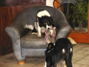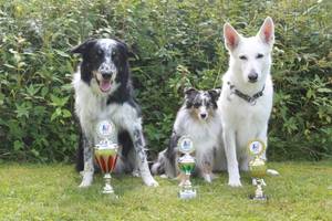 Zu Haus gab es dann natürlich noch eine Foto-Session für ein Siegerfoto, denn auch Bogi´s Papa Aslan und seine Oma Lyra hatten einen Pokal mitgebracht. Das wurde dann auch ausführlich gefeiert - mit dem Lieblingsspiel von Bogi: Tauziehen mit Lyra. Und ehrgeizig wie er ist, gibt er nicht auf, zäh verteidigter "sein" Tau und letztlich gewinnt er auch, hat sein Spielzeug ergattert und wieder ein Quentchen Selbstvertrauen dazu bekommen.