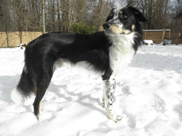 Überwiegend schwarz tragender tricolor Rüde von kräftigem, aber schlankem Wuchs.