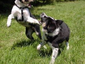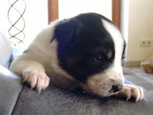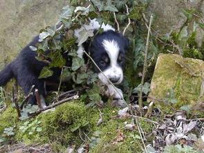 Seit er verstanden hat, daß die Welt hinter unseren, den Welpenraum begrenzenden Bretten weiter geht steht er als Einziger unablässig an den Wänden, wild fiepend und kletternd - will unbedingt in die Freiheit, viel lieber als mit den Anderen spielen. "Breacking the Wall" heißt seine Devise - das gilt für jede Wand, jedes Hinderniss - ob Sofalehne, Brett oder Steine im Garten.