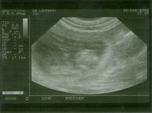 Und da so Allüren wie "mag Morgens kein Futter", "mir ist sooo schlecht", "hab Hunger auf ALLES" usw. auch schon da sind, können wir wohl als sicher annehmen: Angelina ist werdende Mutter! Erste Bilder von den Mini´s![]() ![]() Ich war bisher zwar noch nie, aber diesmal wegen der vielen Fragen war auch ich mit Angelina bei der Ultraschall-Untersuchung. Nachdem der erste Versuch am Dienstag gleich bei Eintritt in die Ordination des TA mit einem Knall, der den Ausfall des Gerätes signalisierte abgebrochen wurde, waren wir dann am Mittwoch, den 16. 12. andernorts erfolgreich.