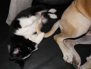 Ein kleiner Junge war gerade auf Besuch - Dynamo´s künftiger Weg- und Spielgefährte - und fragte ganz ängstlich "Mama, tut der Hund den Baby´s weh?". "Nein", kam die Antwort, "sie spielt mit ihnen - wie ich mir Dir. Sanft und zärtlich"