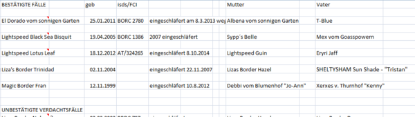 Die nachstehende Liste ist Stand per 12/2014 basierend auf mir zugrundeliegenden, nachweislichen Quellen. Weiters umfasst meine Liste noch 12 österreichische Tiere, bei denen mir aber keine eindeutigen, nachweisbaren Beweise vorliegen, weswegen ich diese nicht öffentlich aufliste. Zwei Tiere aus der Zucht Magic Border fehlen jedenfalls, da mir die Namen bisher nicht bekannt wurden, die Tatsache wird aber auf der Seite der Züchterin von ihr selber fest gestellt, mit dem Hinweis, dass es bei diesen Fällen keine erbliche Epilepsie gewesen wäre.