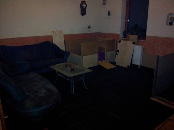 Mittlerweile, am 14. 12. 2011, ist die Welpenanlage - also die Wurfbox, der grosse Auslaufbereich mit Gummi-Unterlage bis unter die "welpenfreundlichen" Leder-Sofas, Holzverkleidung an den Wänden zum Schutz gegen annagen der Kalkwände usw. - schon lange aufgebaut.