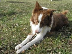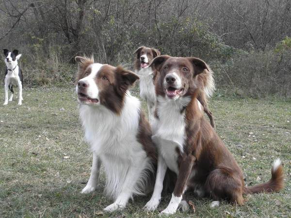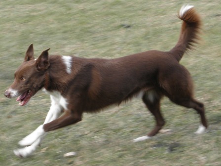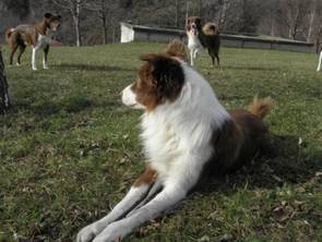 Ganz ähnlich sollte sich der Wurf von T-Blue mit Albena entwickeln. T-Blue - von der Farbe heller im Rot, mehr weiss statt Grau und ohne Motteln - ist nicht nur ein ungemein symphatischer und freundlicher Bursche sondern ebenfalls ein hoch motivierter, sehr schlanker und extrem reaktions-schneller Rüde. Nicht umsonst war er Agility-Champion in einem im Hundesport schon sehr ehrgeizigem Land wie Italien. Und ich habe einige seiner Kinder kennen gelernt - ich war beeindruckt von ihrer Kraft. Viele von T-Blues Verwandten und auch seinen Kindern (er hat mittlerweile beinahe 150!) arbeiten auch im Hütesport oder in der Landwirtschaft mit sehr guten Erfolgen, die meisten allerdings laufen in Agility. Seine Besitzerin Matilde, die 21 Hunde in ihrem Anwesen auf einem Hügel am Rande Rom´s hat, behielt auch aus Zuchtzwecken einige seiner Söhne, so wie der recht kurzhaarige Buldurham "Bujo", der mir mit seiner Kraft und dem freundlchen Wesen besonders gut gefällt.