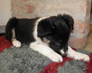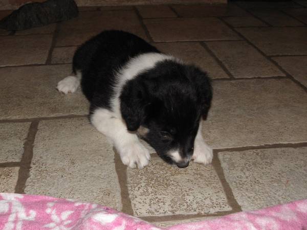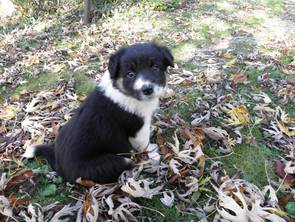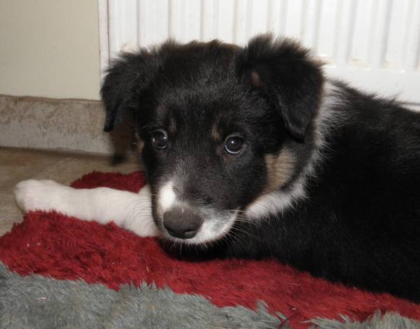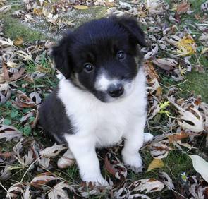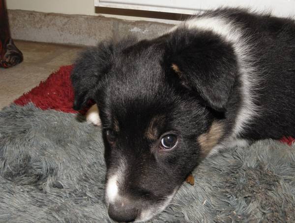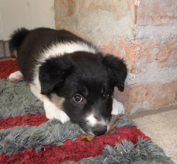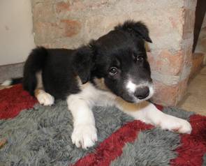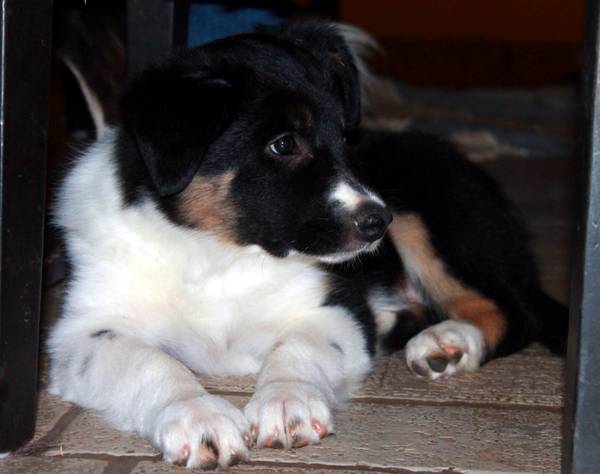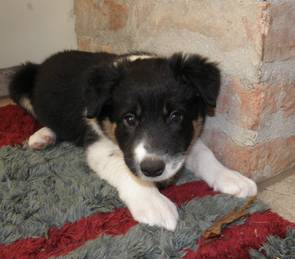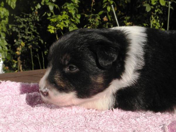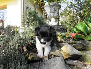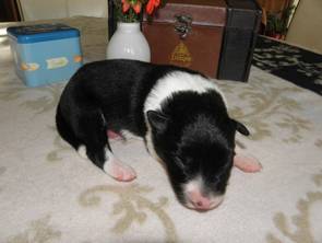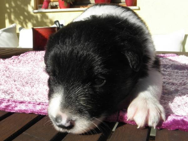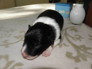 Die vorderen Beine sind beidseitig weiß bis zum Ellenbogen, dann verläuft das Weiss auf der Innen-Seite bis in Brust und Kragen. Der Kopf ist kräftig, regelmäßig geformt mit seitlich etwas höher angesetzten Ohren. Die leicht schwarz pigmentierte Nase ist nur rechts über die vordere Schnauze weiss eingefasst, ansonsten ist der Kopf vollständig schwarz.