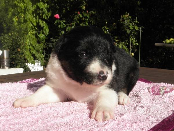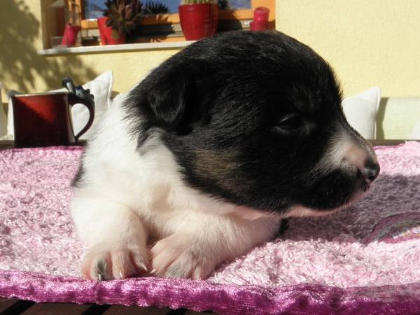 HEDERA, Hündin![]() Überwiegend schwarz tragende, kräftige tricolor Hündin von schlankem Wuchs.
