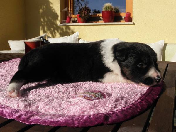 Hedera ist ein sehr lebendiges, besser quicklebendiges kleines Wesen und – obwohl von Beginn an die Zarteste und Kleinste ist sie als Einzige nicht erkrankt wie leider alle ihre Geschwister auf teilweise dramatische Weise und sogar die Mutter (zu lesen bei den H-Welpen). Und so ist sie nun, wie ich diese Zeilen schreibe, das größte und schwerste Tier und „pumperl gsund“ wie man so schön auf österreichisch sagt. Da soll noch einmal jemand sagen, an dem Spruch „Nomen est Omen“ sei nichts dran!