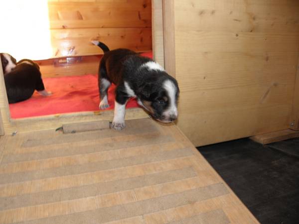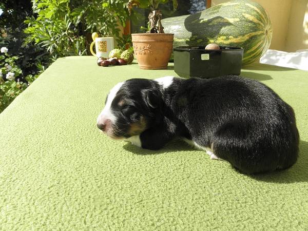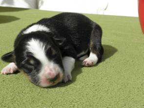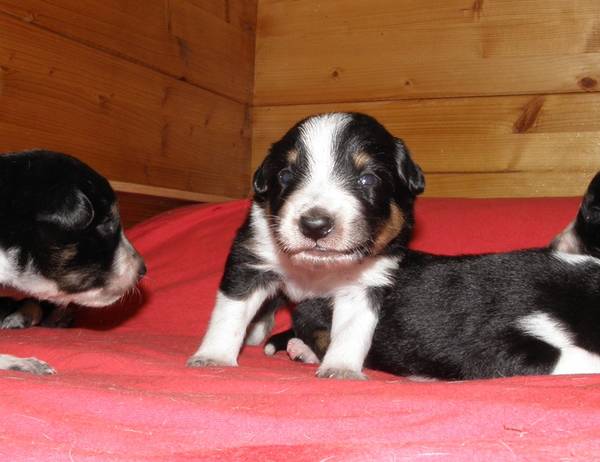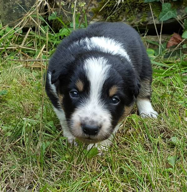 Llew Llaw Gyffes, Rüde (vergeben - bleibt im sonnigen Garten)Überwiegend schwarz tragender, ganz besonders kräftiger gebauter Tricolor-Rüde von kompaktem Wuchs, starkem Knochenbau und kräftigen Extremitäten. Der breite Kopf sitzt auf einem sehr starken, derzeit noch eher kurzen Nacken.