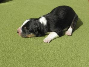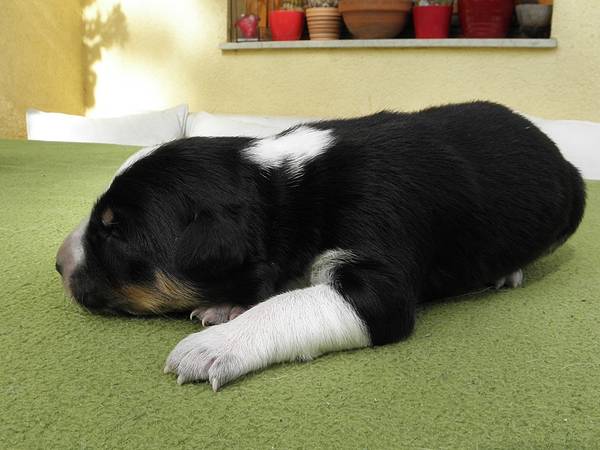 Die bereits jetzt schwarze Nase ist fahlweiss umrahmt, unterseits dürfte sich braun einmischen. Eine mäßig breite weisse Blesse führt über die Schnauze bis über die Stirn. Oberhalb der Augen lassen sich die typischen braunen Male erahnen. Die Wangen sind von einem hellen Braun. Die Kopfunterseite ist weiss bis in die ebenfalls weisse Brust Der gesamte Körper ist von glänzendem Schwarz, Brust und Bauch sind rein weiss.